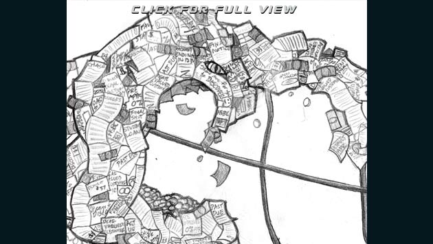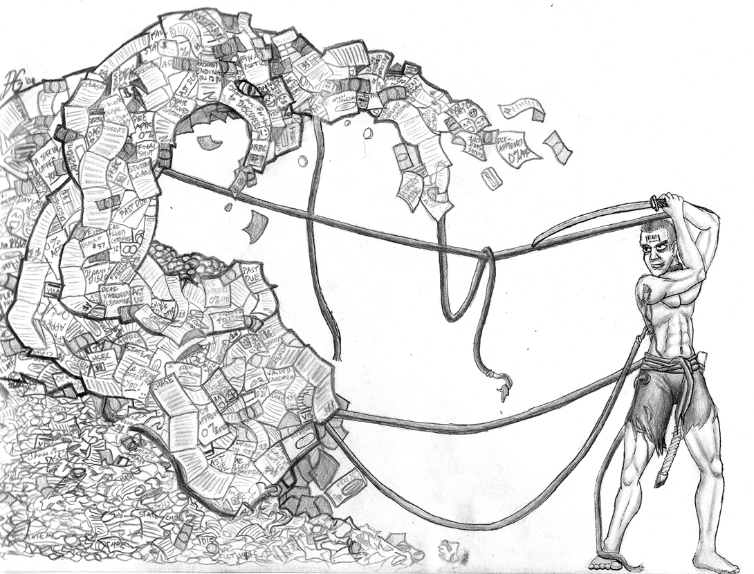 This represents a person turning to fight their problems head on rather than running away from them. Whatever your personal demon is, its hooks will only dig in deeper when you try to escape it. This peice stars my arch-nemisis, the Debt Monster. |